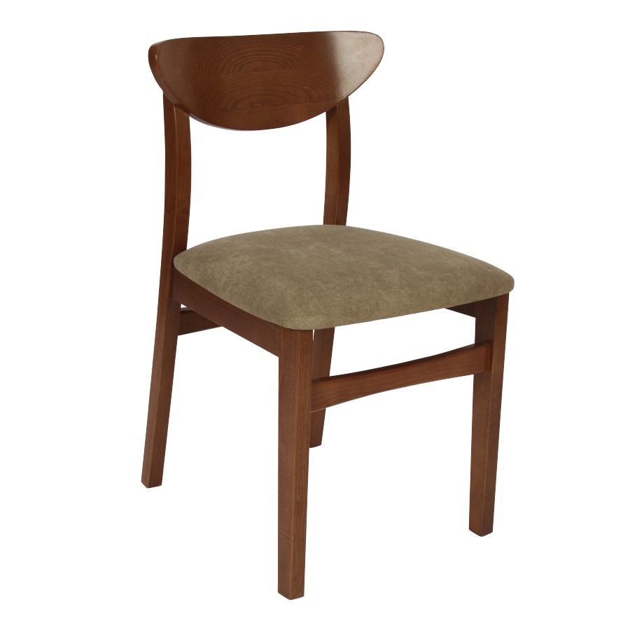 Cadeira em freixo, com acabamento escurecido e estofo em tecido.